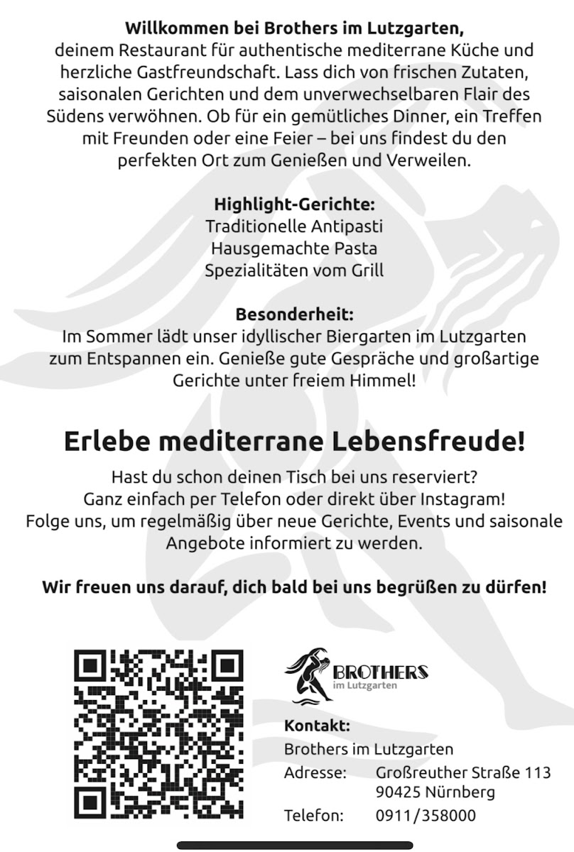 Welcome to Brothers Im Lutzgarten, a culinary gem located in Nurnberg, Germany. With its inviting atmosphere and exceptional service, this restaurant offers more than just your typical pizza experience. According to guest reviews, diners rave about the generous portions that perfectly cater to a hearty appetite, making it ideal for sharing.